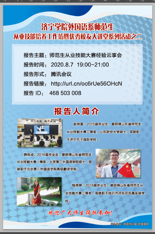 本周五8.7晚上7:00-9:00我系邀请往届优秀师范毕业生赵效菡,薛有成,钱雨婷为全系同学做师范生从业技能大赛经验分享,欢迎大家线上交流。
