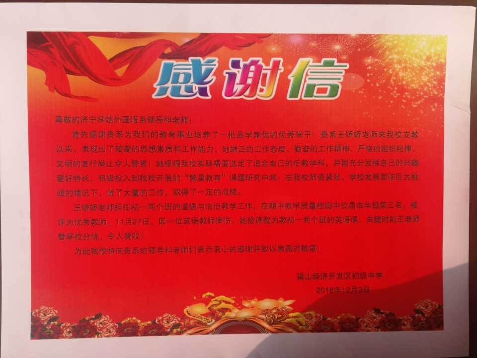 近日,我校实习支教学校梁山经济开发区初级中学发来感谢信,表示外国语系2016级英语教育专业学生王娇娇在执行山东省师范生实习支教工作过程中表现突出,于2018年12月3日被支教学校评为“优秀教师”,感谢我校为基础教育事业培养了一批品学兼优的优秀学子。