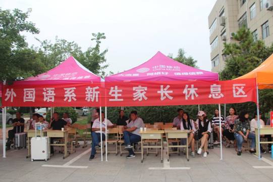 我系教学楼的左侧是外国语系成果展区,可以让家长和学生对外国语系有更清晰的认识和了解。右侧则为家长休息区,志愿者们为舟车劳顿的新生和家长送去最真挚的关怀,让莘莘学子和家长感受到我系的温暖和真诚。