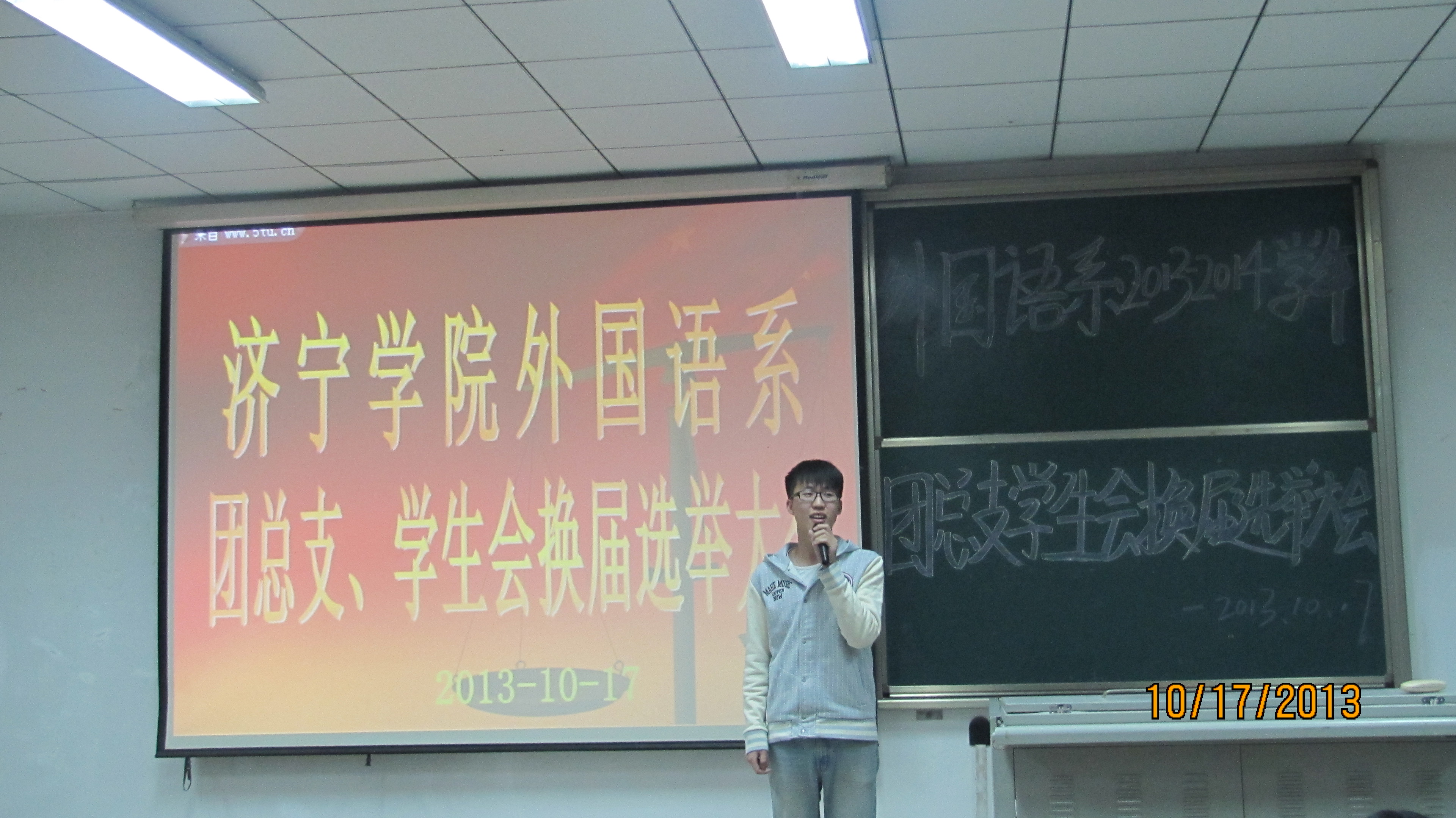 1017号晚7:00,外国语系在(C201)室开召开了外国语系团总支、学生会换届选举大会。40多名竞选代表和原团总支、学生会学生干部及各年级各班学生代表共计160余人参加了会议。外国语系党总支书记王军、团总支书记徐俊凯也出席了会议。