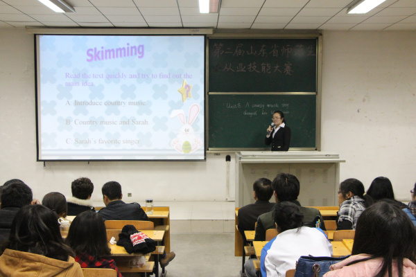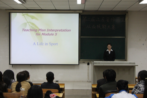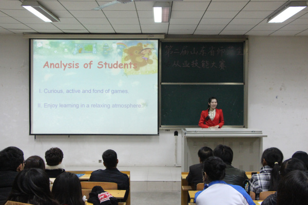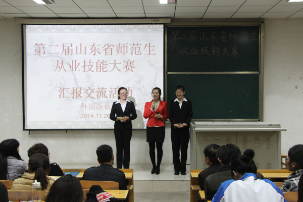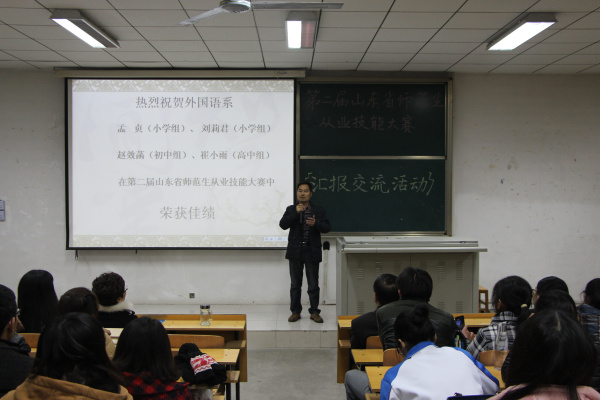 2014年 11月26日晚6:30外国语系在C201教室成功举办了“第二届山东省师范类高校学生从业技能大赛”获奖选手讲课汇报交流活动,4位获奖同学先后进行了精彩的说课、模拟讲课,讲述了自己的备课过程和参赛感悟,最后与同学们互动,回答了大家关注的许多问题,给同学们提供了一个学习、观摩和现场交流的机会。