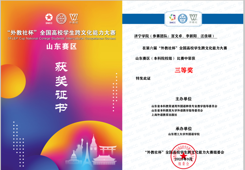 近日,第六届“外教社杯”全国高校学生跨文化能力大赛(本科院校组)山东赛区复赛和决赛在山东理工大学举办。完美(中国)一站式服务平台宫文卓、汪佳硕、李新阳三位同学获得山东赛区三等奖。