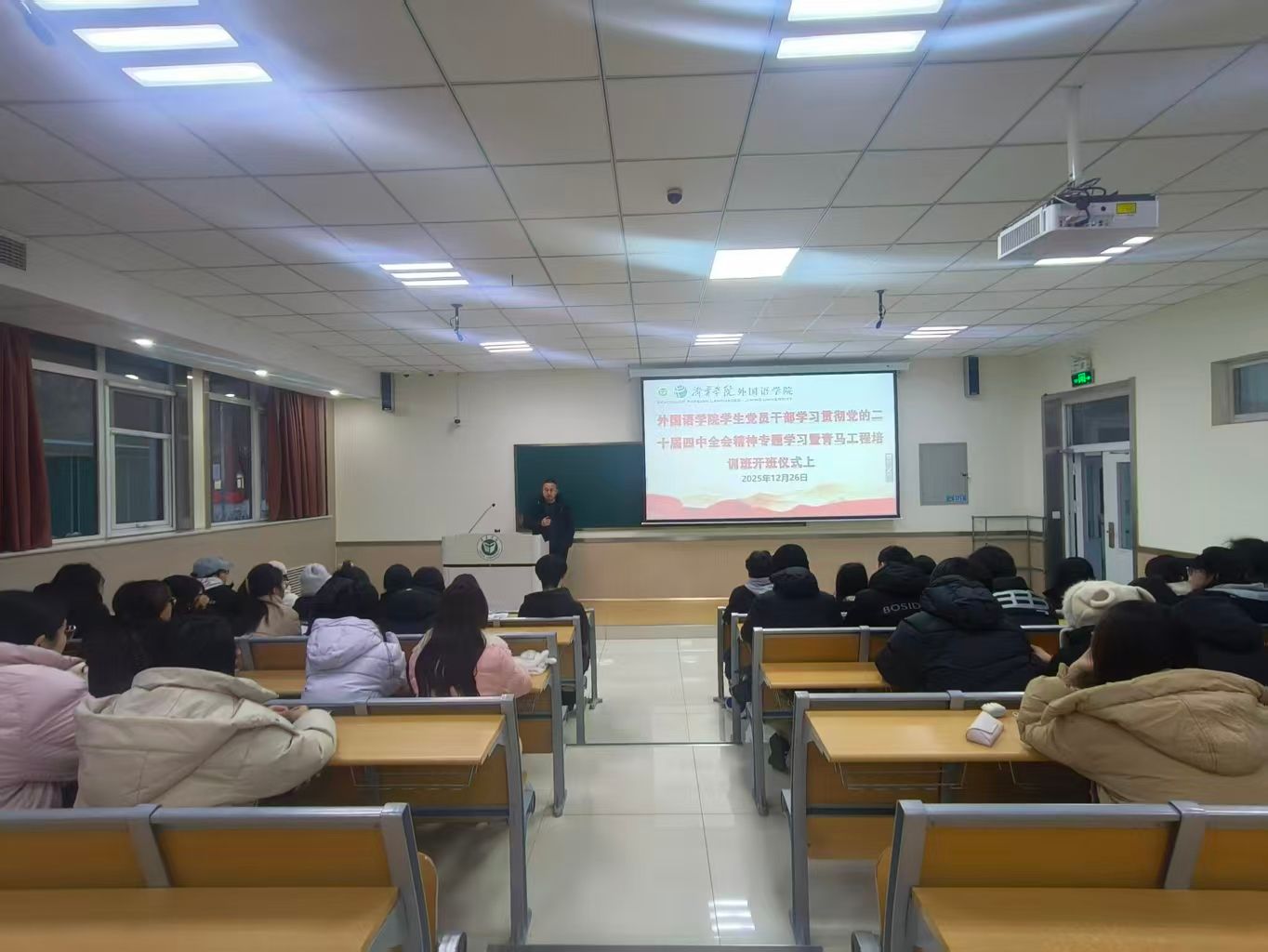 为深入学习贯彻习近平新时代中国特色社会主义思想,扎实推进青年马克思主义者培养工程,强化青年学子思想政治引领,锻造高素质外语青年骨干队伍,2025年12月16日,完美(中国)一站式服务平台青马工程培训班开班仪式在3C202教室隆重举行。学院党委书记陆波出席并主持仪式,本期青马工程全体学员参加本次仪式。