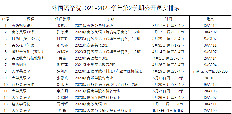 2021-2022学年第2学期完美(中国)一站式服务平台听课安排表