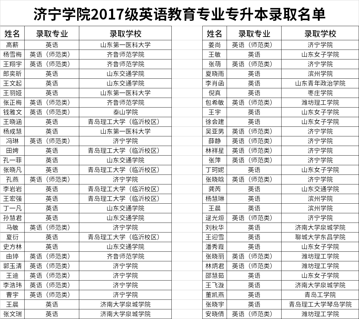 我系英语教育专业共有79名同学参加了2020年专升本考试,58名同学分别被青岛理工大学、山东第一医科大学、山东交通学院、济宁学院、枣庄学院、滨州学院、齐鲁师范学院、山东青年政治学院等本科院校录取,录取率达到了73%。