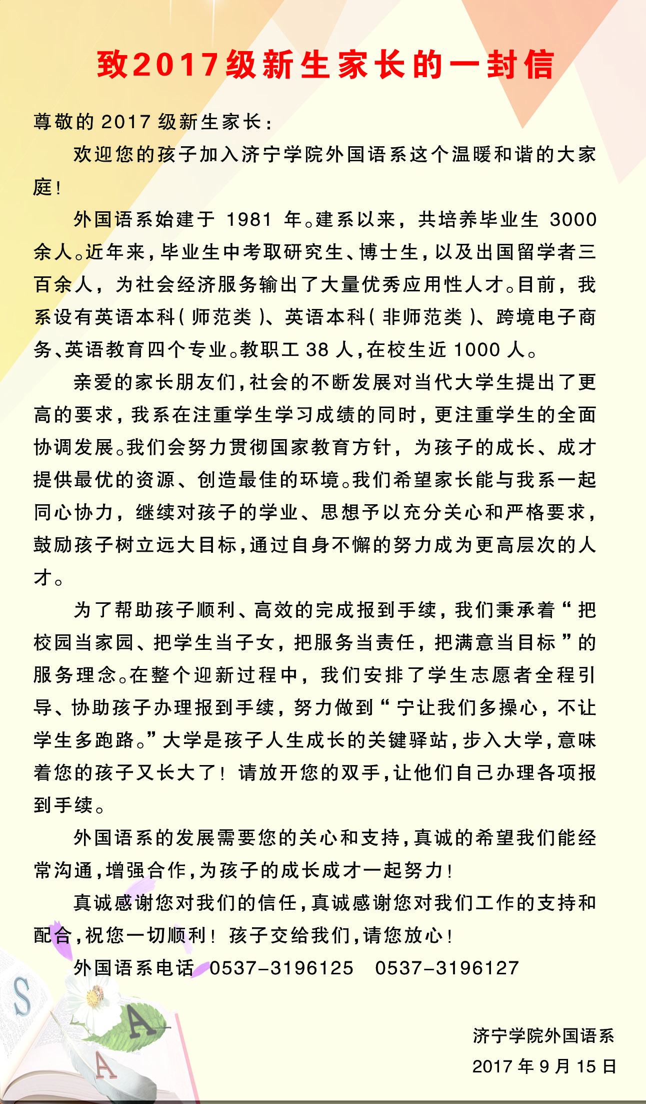 致2017级新生家长的一封信