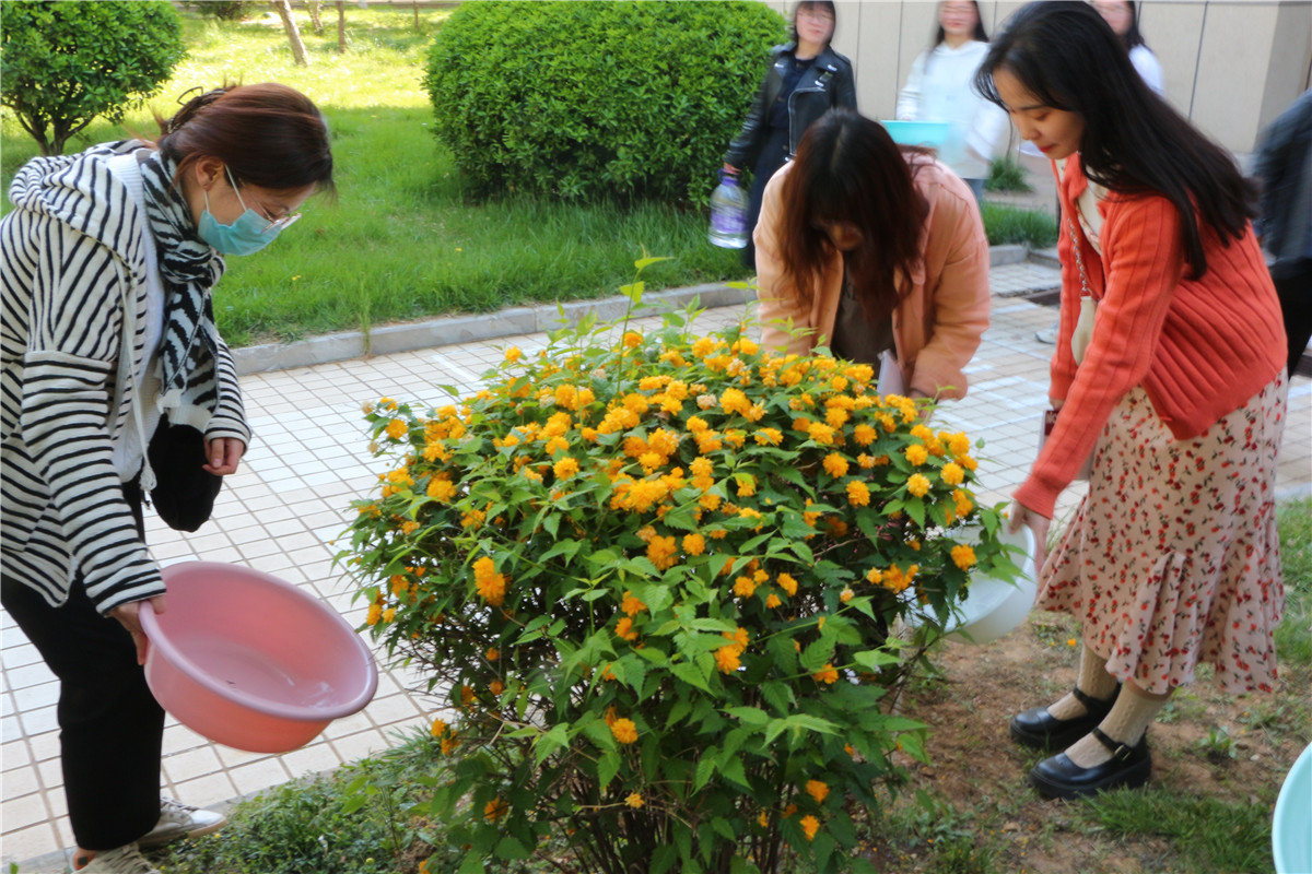 首先,全体党员举起右手面向党旗重温入党誓词。“我志愿加入中国共产党……随时准备为党和人民牺牲一切,永不叛党。”铿锵恢宏的誓词,强烈震撼着在场的每一位党员,一字一句,表达了全体党员不忘初心、牢记使命,在习近平新时代中国特色社会主义思想指引下,传承先烈精神、勇于担当奉献的坚定信念。随后,全体党员分别讲述了党史故事,“沂蒙红嫂”明德英乳汁救伤员、“沂蒙母亲”王换于创办战时托儿所、“沂蒙大姐”李桂芳带领32名妇女架起火线桥的“沂蒙精神”、战地女杰贺子珍、“延安精神”、“井冈山精神”、“西柏坡精神”、“当代挑山工精神”、“脱贫攻坚精神”等,并分享了自己的感想。最后,全体党员在校园内给花草树木浇水,用实际行动践行了党员的奉献、进步的精神。