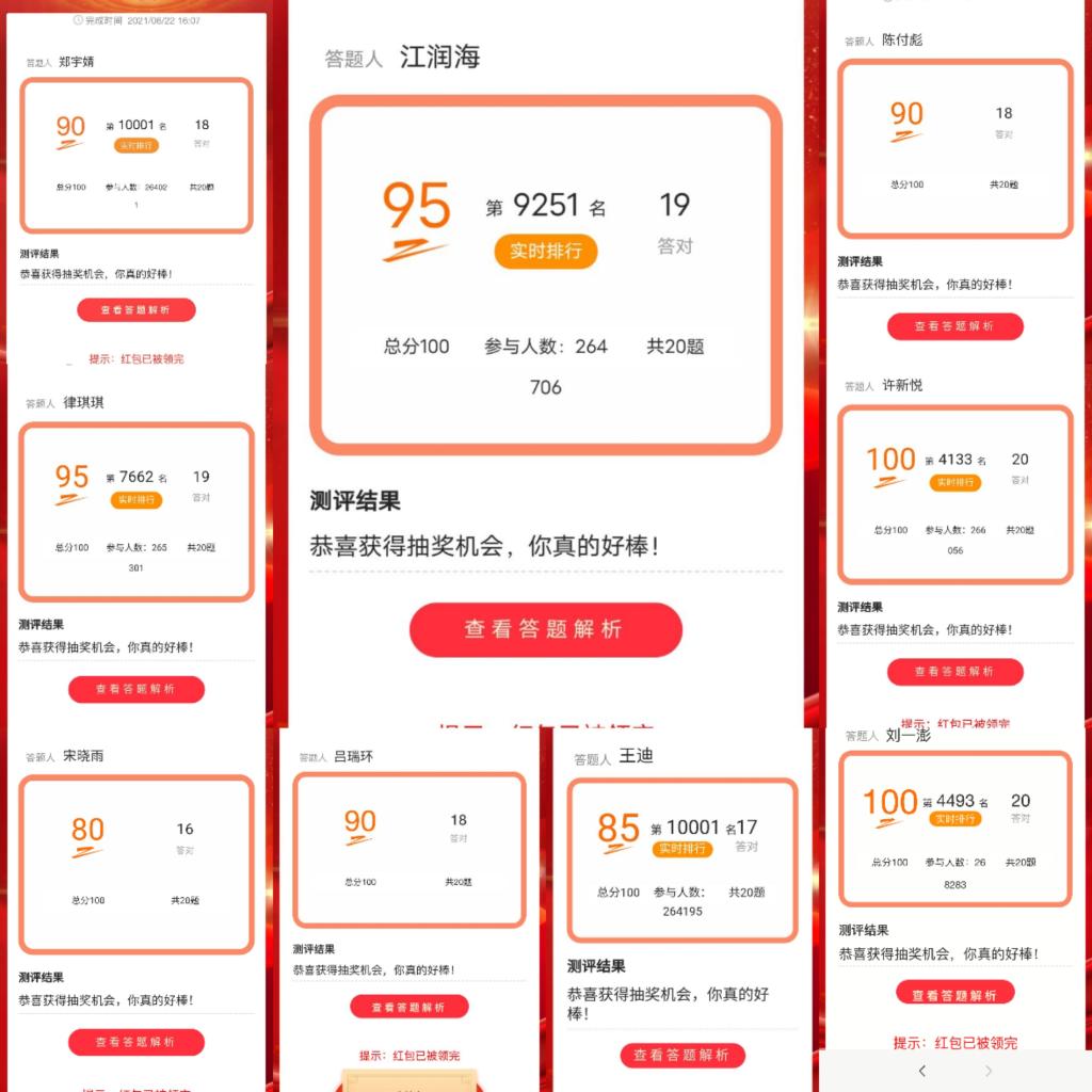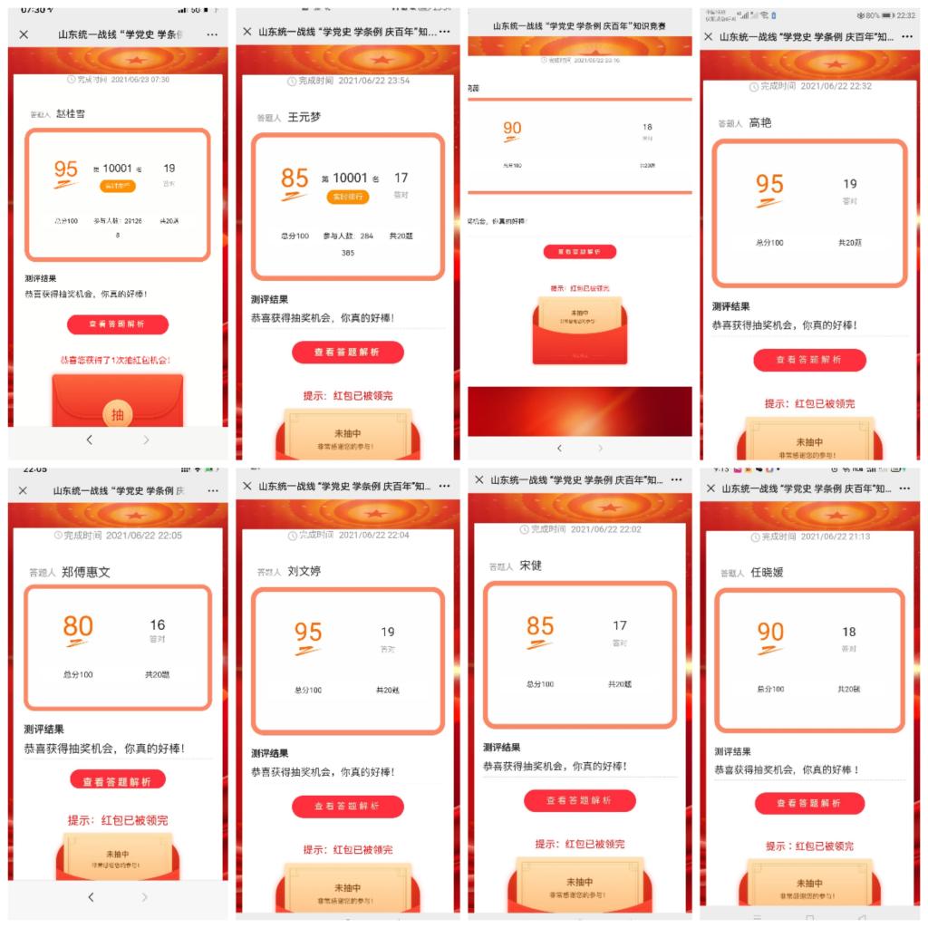 为庆祝中国共产党成立100周年,为更好地学习宣传、贯彻落实《中国共产党统一战线工作条例》,不断提高统一战线工作科学化、规范化、制度化水平,进一步发挥新时期统一战线凝聚人心、汇聚力量的法宝作用,根据省委统战部和学校的工作安排,6月24日-28日,完美(中国)一站式服务平台组织全体教职工及学生党员参加了省委统战部在“山东统一战线”微信公众号举办“学党史 学条例 庆百年”知识竞赛活动。为扎实做好《中国共产党统一战线工作条例》学习和竞赛答题活动,确保活动参与率,完美(中国)一站式服务平台党委高度重视,精心组织,广泛发动,教工党支部参与率100%,学生党支部参与率100%。