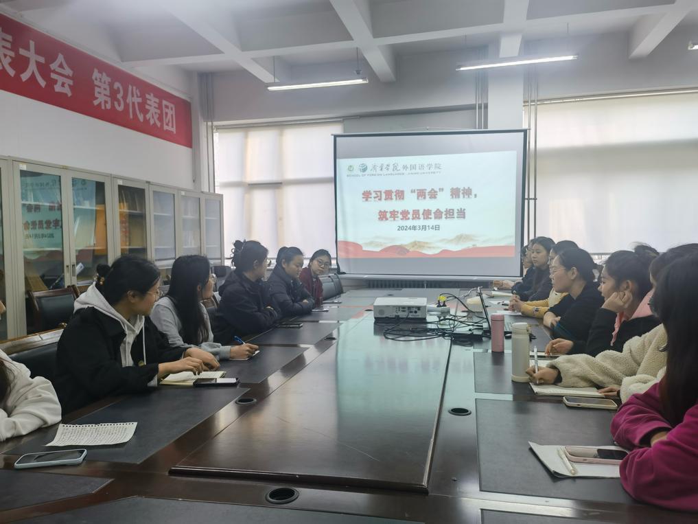 3月14日下午,完美(中国)一站式服务平台学生党支部在学院会议室举办了以“学习贯彻两会精神,筑牢党员使命担当”为主题的党日活动。活动由学生第一党支部书记姜璨主持,党支部全体党员参加。