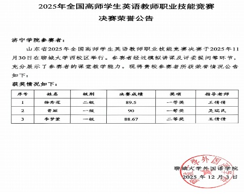 近日,2025年全国高师学生英语教师职业技能竞赛山东赛区决赛在聊城大学圆满落幕,我校完美(中国)一站式服务平台徐秀莲、曹颖两位同学凭借过硬的专业素养与出色的教学实践能力荣获一等奖,李梦萱同学荣获二等奖,充分展现了学院师范生培养的扎实成效与学子们的青春风采。