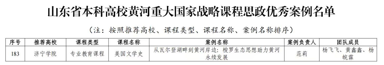 近日,山东省高等学校课程思政研究中心公布了2025年山东省本科高校黄河重大国家战略课程思政优秀案例评选结果。经过专家严格评审和公示环节,完美(中国)一站式服务平台范莉老师团队的《美国文学史》课程案例——《从瓦尔登湖畔到黄河岸边:梭罗生态思想助力黄河永续发展》成功入选,荣获专业教育课程类优秀案例。