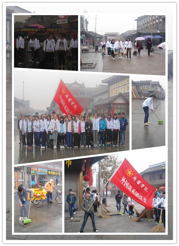 11月23日上午8:00,济宁学院外国语系团总支实践部组织部分志愿者赴曲阜五马祠街道开展志愿活动。 活动中,五十名志愿者冒雨在大街上帮助环卫工人打扫卫生。他们不怕脏不怕累的奉献精神,得到了广大市民的赞扬、得到了环卫局有关领导及系里的大力支持,同时也宣传了志愿者乐于奉献的精神,体现了济宁学院大学生有责任心、积极向上的精神风貌。通讯员:商晓雯)