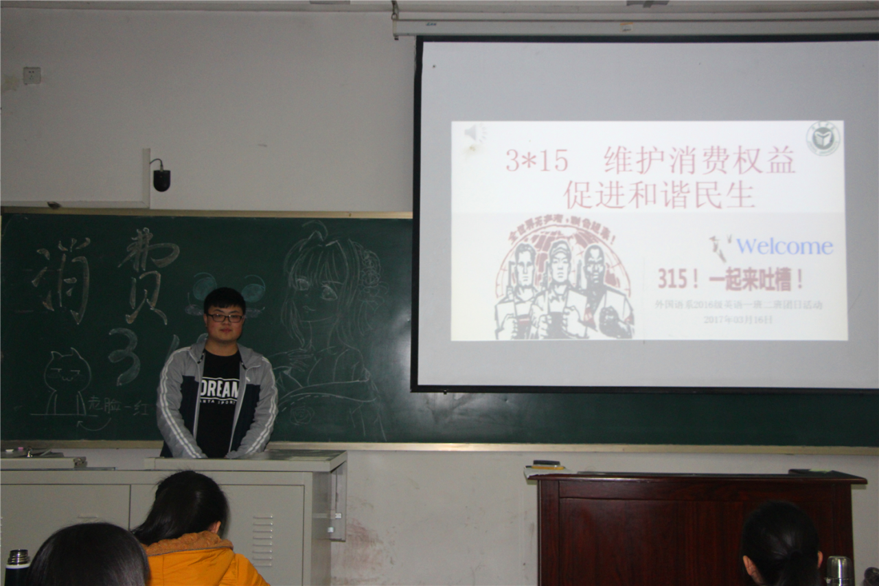 3月16日晚7:00,由外国语系团总支主办的,以“关注3.15,共同维护消费者权益”为主题的团日活动在A301室举行。2016级同学参加了此次活动。