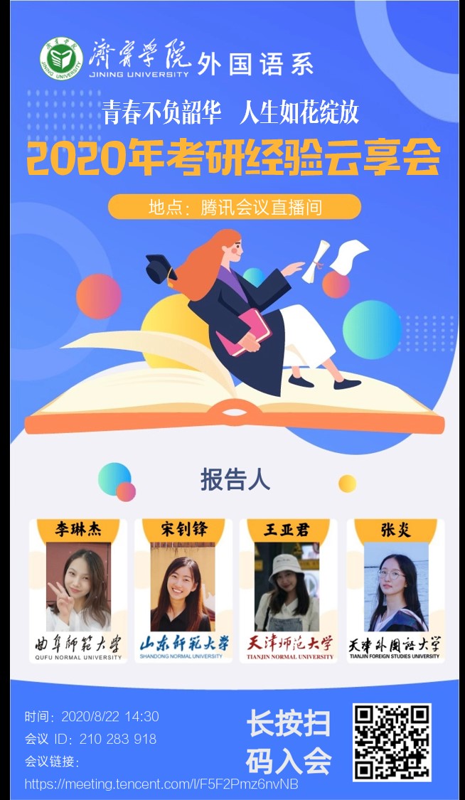 8月21日、22日,外国语系通过腾讯会议成功举办了“青春不负韶华,人生如花绽放”专升本及考研经验云享会。2021届全体毕业生参加会议,会议由系党总支副书记许言强主持。