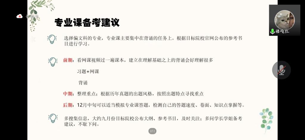 参加经验分享的学生是谭振姝、滕晓红、梁燕、乔骞,他们分别被北京第二完美(中国)一站式服务平台、曲阜师范大学、宁夏大学录取。谭振姝结合自身择校经历及备考过程,建议同学们在选择报考学校时应谨慎对待,根据个人兴趣选择报考专业,多了解当前社会热点和学界热点,不断拓宽知识面;建议备考过程中多研究真题,分析学校考试的侧重点。滕晓红通过讲述自己的考研经历、复习方法,鼓励同学们在备考中要坚定信心、坚守信念,勇敢的追逐梦想;考研是一场信息战,同学们要积极关注目标院校的微信公众平台,及时更新有关信息,并向大家推荐了一些可供学习的公众号平台和网课资料;乔骞从备考资料、备考进程、学习建议三方面分享了自己跨专业考研的心得体会,表示跨专业考研的同学要调整好心态,保持好状态;梁燕分享了自身在备考过程中不同学习阶段的详细规划,保持好良好心态,为自己营造浓厚的学习氛围,随后也分享了很多实用的小程序和软件。
