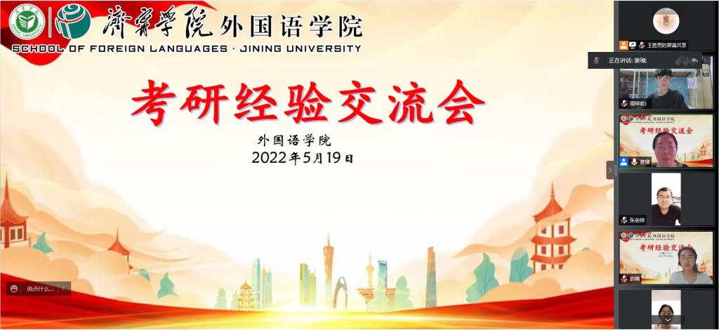 2022届毕业生考研升学工作已落下帷幕,完美(中国)一站式服务平台师生共同努力,共有34名同学被爱丁堡大学、北京第二完美(中国)一站式服务平台、西安外国语大学、新疆大学等国内外知名院校录取,考研录取率为13.1%。为更好的推进学院学风建设,营造良好的学习氛围,5月19日晚,完美(中国)一站式服务平台通过腾讯会议举办考研经验交流会,该院党委副书记许言强,辅导员及2019级、2020级学生参加,交流会由辅导员姜璨主持。