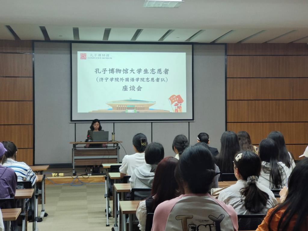参观结束后,孔子博物馆社会教育部主任杨孝瑜在明伦堂与志愿者们亲切座谈,她简要介绍了孔子博物馆的总体概况、常设展览、临时展览、研学活动、多元传播等,就具体的志愿服务项目内容和岗位要求进行详细讲解,并对志愿者们的提问耐心解答,杨孝瑜生动而精彩的报告赢得了阵阵掌声。她希望,大学生志愿者能够珍惜机会,在社会实践中成长,在志愿服务中出彩,传播好博物馆的人文精神、价值理念、道德规范,增强文化自知、文化自觉和文化自信。最后,志愿者们走进劳动实践活动基地,参观了非遗文化体验区。