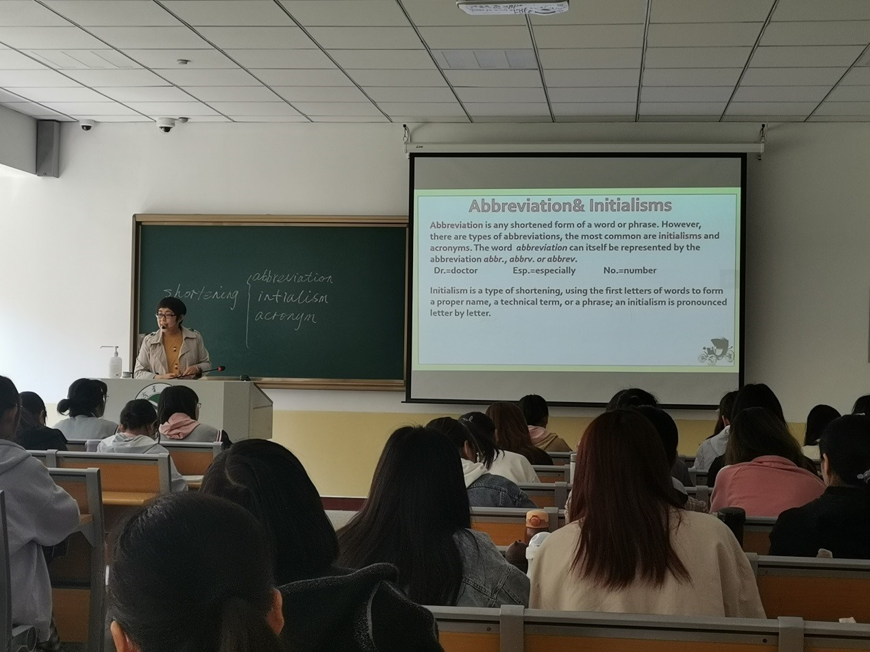 活动分为听课和研讨两部分。首先,听课环节由栾珍老师2#A106结合时下热点词汇和视频导入“英语词汇学”这门课程,一开始就吸引了台下学生的注意力。栾珍老师教学过程完整流畅,教学仪态得体大方,雨课堂操作娴熟,师生互动融洽,为听课教师做了很好的教学示范。