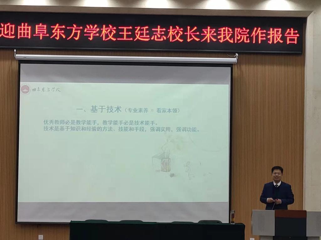 王校长首先谈到从《论语》中的“兴于诗,立于礼,成于乐”获得了讲座题目的灵感,然后结合自己的工作经历、人生感悟以及东方学校的办学理念用幽默风趣的语言谈了自己对英语教育与英语教师发展的理解。他认为技术是基于知识和经验的方法、技能和手段。优秀教师必是教学能手,教学能手必是技术能手,并从英语专业素质、英语教学技能、通用教学技能三个方面详细讲解了如何才能成为技术能手、教学能手、优秀教师。立于品德就是品德素养,包括个人品德、职业道德、正确观念,强调了一名老师“学高为师,德高为范”的重要性,勉励大家做习近平总书记说的“有理想信念、有道德情操、有扎实知识、有仁爱之心” 的好老师。最后,王校长谈到高品质不等于高质量,职业品质是道术、德才的完美结合,并分别从学生、教师和团队三个层次解读了何为高品质以及具体表现。