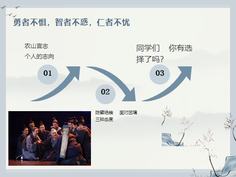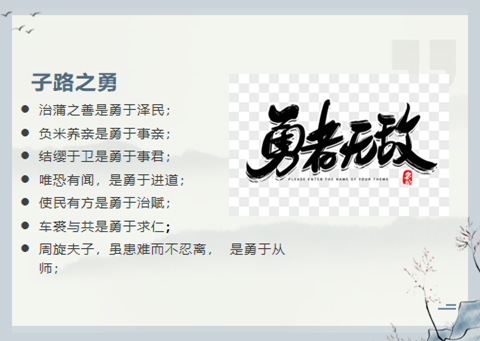 出身寒门的子路是敢于直谏的勇士,仲由一生忠于孔子,子曰:“道不行,乘桴浮于海,从我者,其由与!”孔子赞扬子路“勇人也,丘弗如也”。