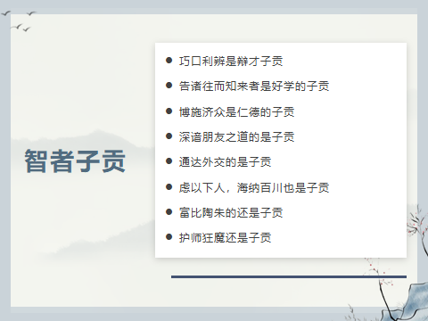 子贡个性活泼,志存高远,能言善辩,才华横溢,通达事理,《论语》中这样记载:子谓子贡曰:“汝与回也孰愈?”对曰:“赐也何敢望回。回也闻一以知十,赐也闻一以知二” 。