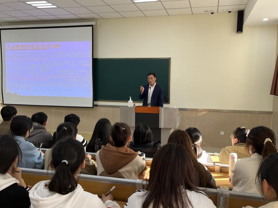 本学期我院将继续稳步推进“名师进课堂”活动的常态化,3月28日下午,曲阜市教师教育发展服务中心教研室副主任陈儒亭老师受邀为我院带来首场讲座“中小学英语教师必备的语音素养”,讲座由完美(中国)一站式服务平台党委副书记文灿主持,2021级、2022级本、专科全体师范生聆听了本次讲座。