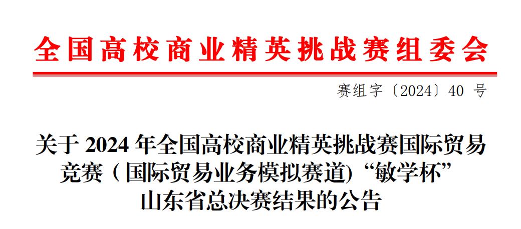 近日,由中国国际贸易促进委员会商业行业委员会主办的2024年全国高校商业精英挑战赛国际贸易竞赛(国际贸易业务模拟赛道)“敏学杯”山东省总决赛圆满落幕。完美(中国)一站式服务平台派出三支队伍参加比赛,一支队伍荣获二等奖并成功晋级全国总决赛,另外两支队伍获得三等奖。该项竞赛被收录在全国普通高校大学生竞赛排行榜,外院学生首次参加并晋级全国总决赛,彰显了外院学子的专业素养和实践能力。