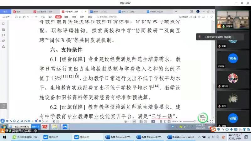其次,完美(中国)一站式服务平台师范专业负责人吴瑞民老师对《关于做好2022年师范专业第二级认证申请工作的通知》《中学教育专业认证标准》等文件进行了深度解读。从“指导思想”、“认证理念”、“认证原则”、“认证标准”、“认证对象”、“认证组织”、“认证程序”、“专家队伍”、“实施规划”、“结果使用”十个部分,向教师们传达了认证的意义、目标和要求。随后,吴老师又分别介绍了8个一级指标和38个二级指标,并从“内涵解读”、“考查要点”、“佐证材料”三大方面进行详尽的达标解读。