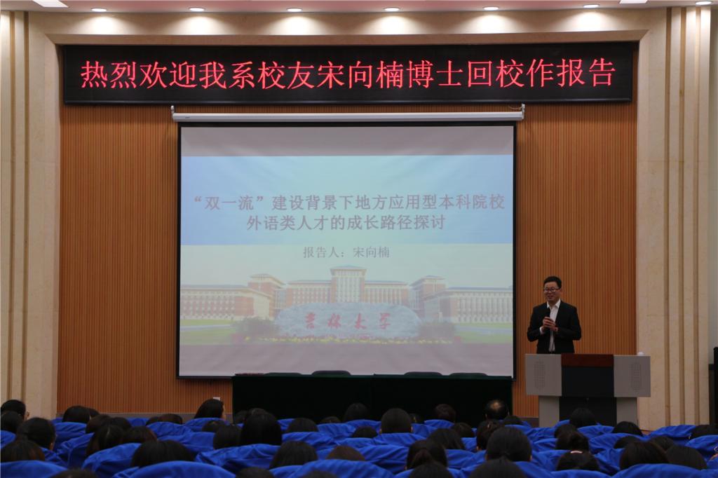 11月13日晚,我系校友、吉林大学行政学院博士研究生宋向楠走进“校友大讲堂”,作了题为《“双一流”建设背景下地方应用型本科院校外语类人才的成长路径探讨》的学术报告。外国语系主任杨楠教授、校统战部副部长徐俊凯、外国语系辅导员及全体师生200余人参加了此次报告会。报告会由外国语系副主任张颖主持。