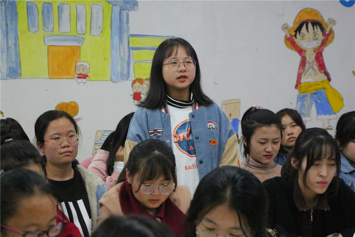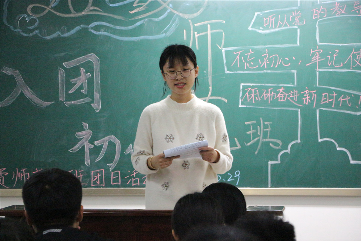 在本次活动中,团支书聚焦“不忘入团初心 牢记青春使命”这一主题,阐述了主题的深层含义,“青年一代有理想、有本领、有担当,国家就有前途,民族就有希望”,牢记总书记的嘱托,作为新时代大学生理应将血液里流淌着的红色精神、身体里印刻着的红色基因继续传承下去,牢记使命,砥砺前行,各班还一起学习了党的发展历程和社会主义核心价值观等内容。各班同学还进行了演讲,阐述了青年人对祖国发展的重要意义,“青年一代的理想信念,精神状态,综合素质,是一个国家发展活力的重要体现,也是一个国家核心竞争力的重要因素”,号召全体同学努力成为“有理想、有学问、有才干的实干家”,努力为我国社会主义现代化建设做出贡献。最后,同学们齐唱《强军战歌》,活动在同学们雄壮嘹亮的歌声中结束。