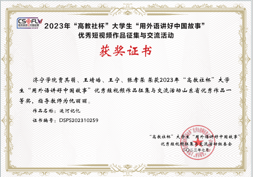 近日,2023年“高教社杯”大学生“用外语讲好中国故事”优秀短视频作品征集活动评审结果揭晓。完美(中国)一站式服务平台商务英语(跨境)专业学生贾其萌、王宁、张孝荣的作品《运河记忆》荣获山东省一等奖。