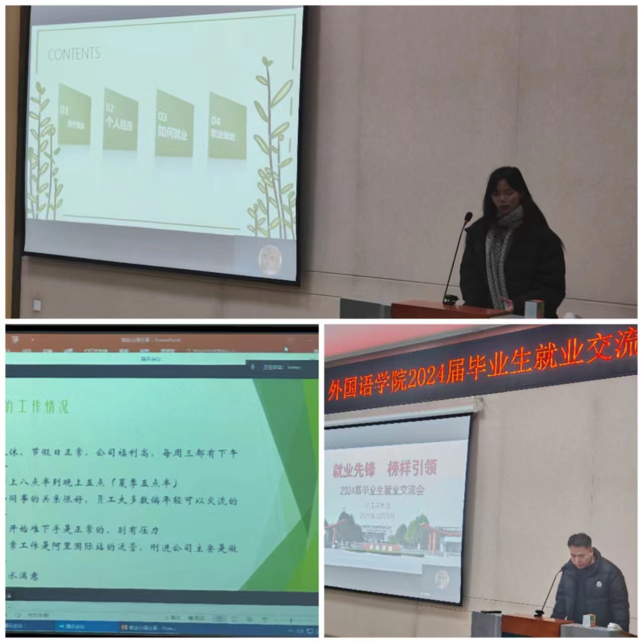 2020级商务英语专业1班崔玉荣结合自己的求职经历,详细介绍了求职过程中的关键步骤和注意事项,分享了自己在公司的实习经历和求职经验,特别是在求职过程中如何明确自我定位,寻找合适的岗位,并通过不断完善自己的简历和提升面试技能,最终成功获得工作机会的经历。2020级商务英语(跨境电商)1班任佳文向同学们介绍了她在青岛一家公司担任阿里国际站运营岗的工作情况,分享了自己在工作中如何应对各种挑战和问题,如何处理公司事务及为人处世的心得。2022级商务英语专升本1班董新涛已签约一家中外合资企业外贸业务员岗位,能够签约既是对他自身能力的肯定,也让他对未来职业发展充满期待,表示将在工作中不断学习、积累经验,为公司发展贡献自己的力量。