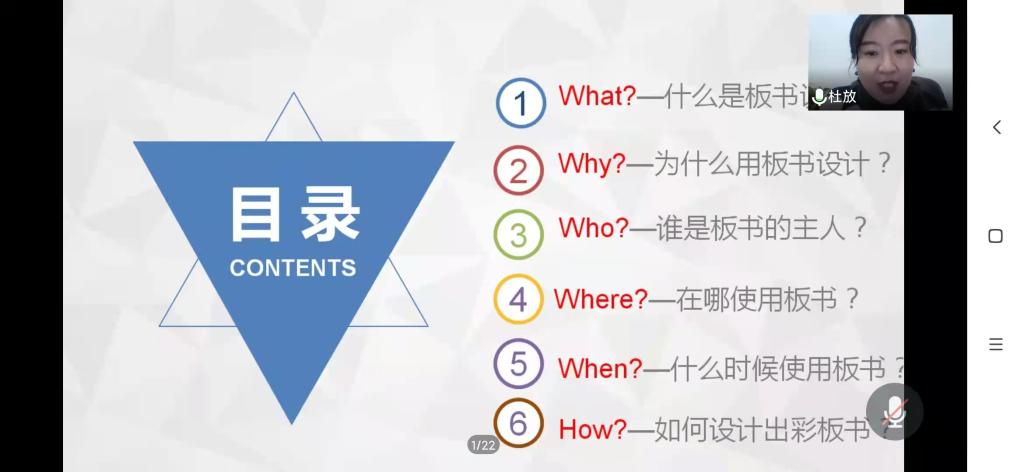 本次讲座虽然是线上的形式,没有面对面的交流,但正如杜校长一开始说的那样,距离的远隔阻碍不了真挚的交流,隔空对话,却还是一样激情澎湃,一样感动人心。透过方寸之间板书技巧的讲授,映射整个教学课堂,让人徜徉知识殿堂的同时也享受了一场图文并茂的视听盛宴,正阐释了那句话,教育是一门艺术,只要用心,每个人都可以成为讲台上的艺术家。