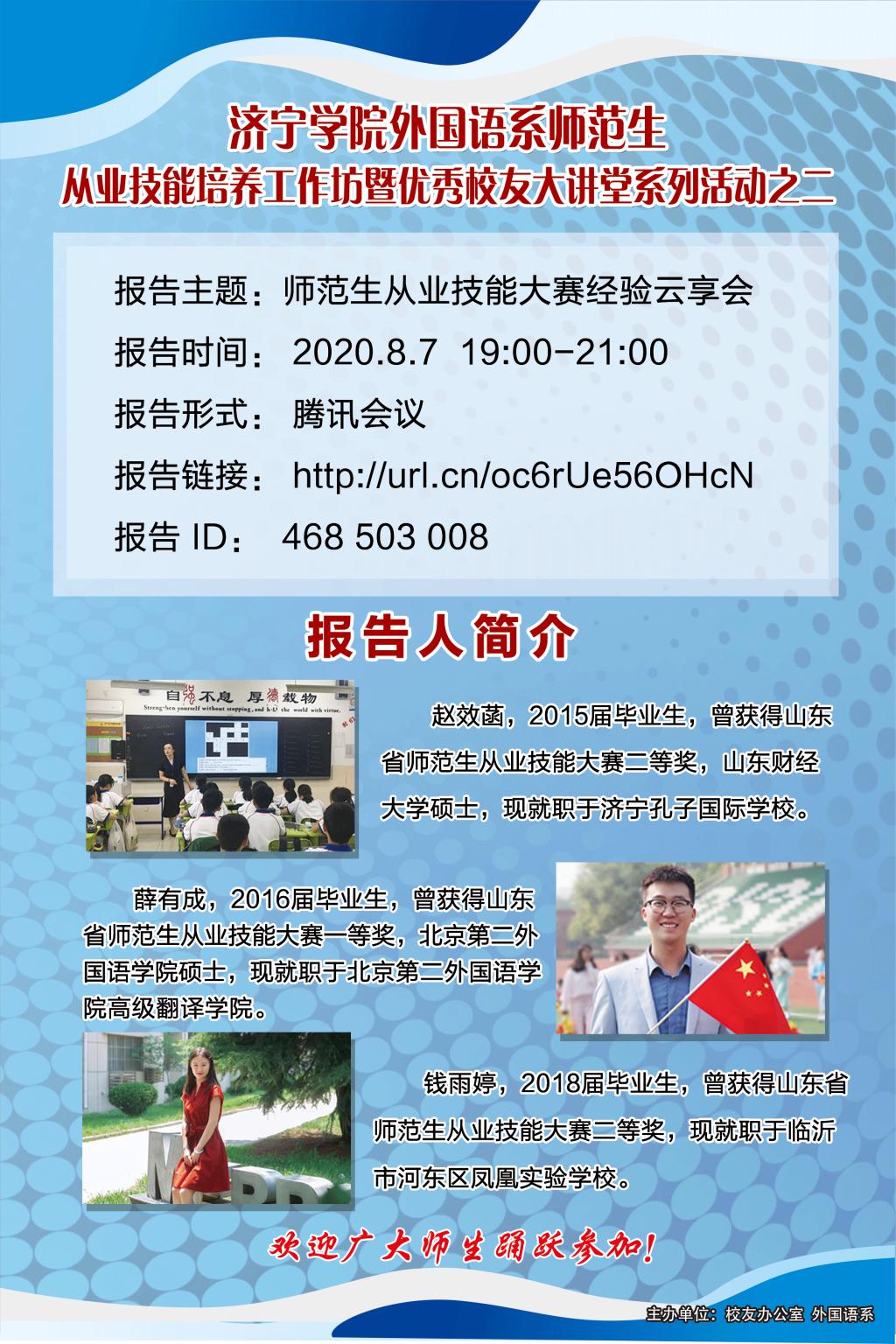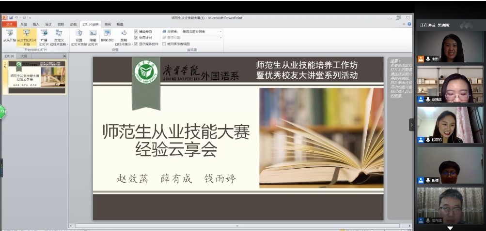 为提升师范生的专业技能和核心素养,提高师范类专业人才培养质量,落实立德树人根本任务,8月7日晚19:00-21:00, 外国语系通过腾讯会议成功举办师范生从业技能培养工作坊暨优秀校友大讲堂系列活动第二期:师范生从业技能大赛经验云享会。本次工作坊邀请了山东省师范生从业技能大赛一等奖获得者薛有成、二等奖获得者赵效菡和钱雨婷在线分享参赛经验和心得,杨楠主任致开幕词并总结发言,外国语系教师和260多名师范生共同参加了线上交流,系副主任张颖主持本次活动。